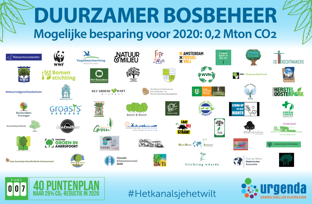 WNF, Natuurmonumenten, de Vogelbescherming, Natuur en Milieu en 58 andere natuurorganisaties bundelen hun krachten voor een duurzamer bosbeheer. Zij presenteren samen met Urgenda vandaag maatregel nummer 7 van het 40puntenplan om 25% CO₂ te besparen voor eind 2020. Directeur Natuur en Biodiversiteit Donné Slangen van het ministerie LNV neemt de maatregel in ontvangst. De maatregel pleit voor een duurzamer beheer van onze bestaande bossen en leidt tot bijna 0,2 CO₂ Mton (megaton) besparing per jaar. Bosbeheer waarbij hier en daar een boom wordt gekapt, in plaats van hier en daar een halve hectare, leidt tot meer koolstofopslag voor het klimaat en tegelijkertijd tot meer biodiversiteit. Ander bosbeheer, zonder kaalkap, is een effectieve en goedkope maatregel waarvoor het Kabinet kan kiezen om aan de uitspraak in de Klimaatzaak van de rechter te voldoen.