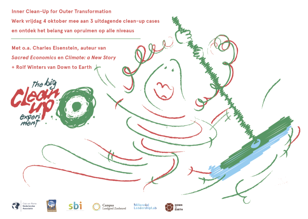De Club van Rome Nederland, Earth Charter, de Down to Earth Collective, Campus Landgoed Zonheuvel, Stichting SBI en het Millennial Leadership Lab (MLL) nodigen de makers en vernieuwers van Nederland uit om effectiever te worden in hun bijdrage aan de transitie, door beter te worden in opruimen op alle niveaus: fysiek, emotioneel, mentaal en op zielsniveau.